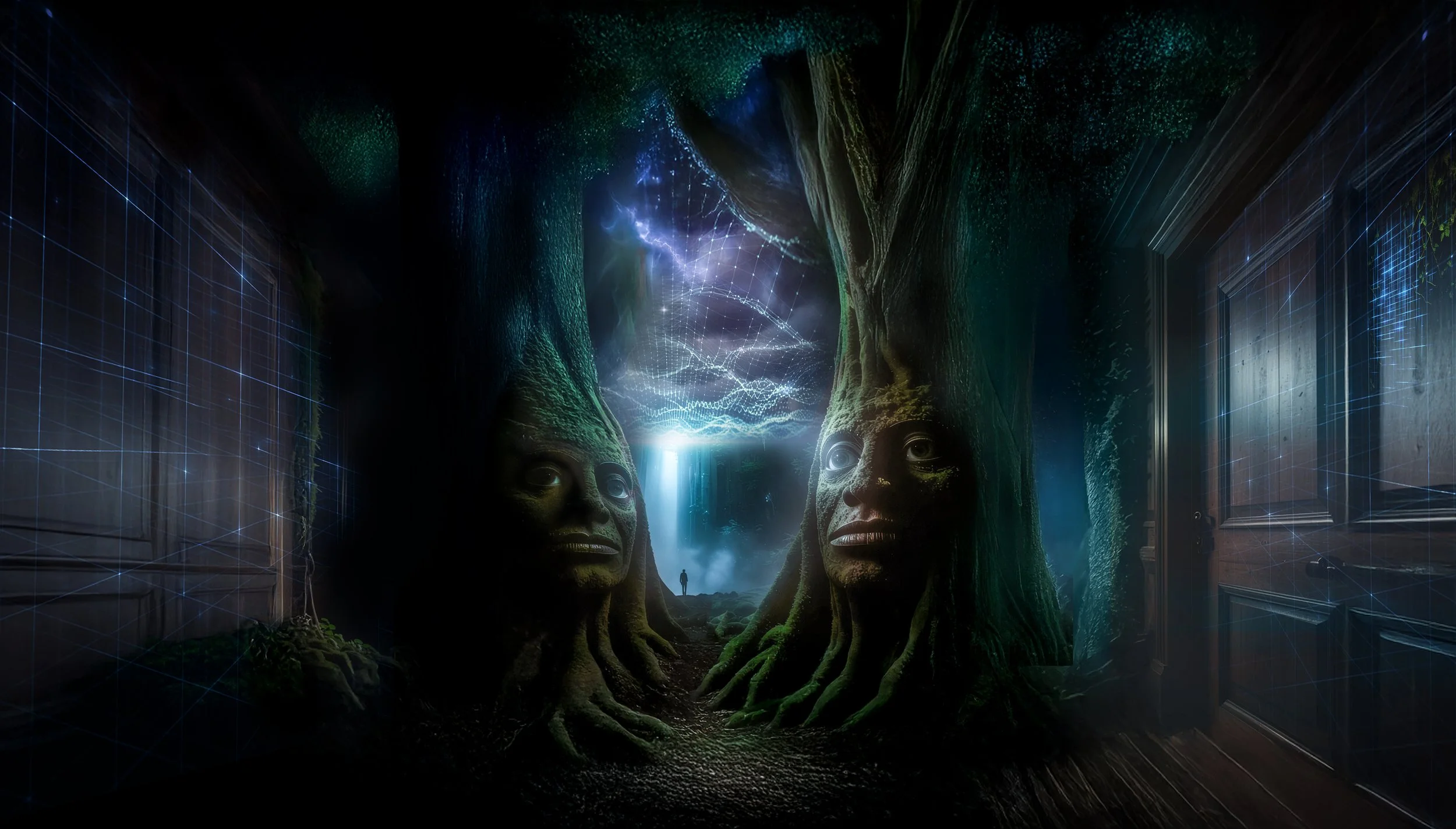 Upon the moment he wondered what he was doing here, two large cavities opened from the floorboards like a camera’s iris, revealing a glowing electronic blue light. The holes were at least ten feet in diameter, but before he could judge precisely, out raised two large brown totem poles grinding against the edges of the cavities spinning counter to one another. They were chiseled with species Brian did not recognize, and as slow-moving drill bits they stretched sixty feet into the air, stopping when two wide humanoid visages at the bottom faced him. The soft tar of the wood, like brown resin, prompted Brian to attempt to touch it, but he stumbled back when the carved humanoids’ eyes shot open.